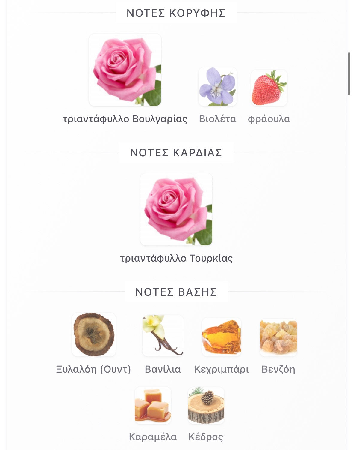- Νότες: Τριαντάφυλλο, Oud, βανίλια.