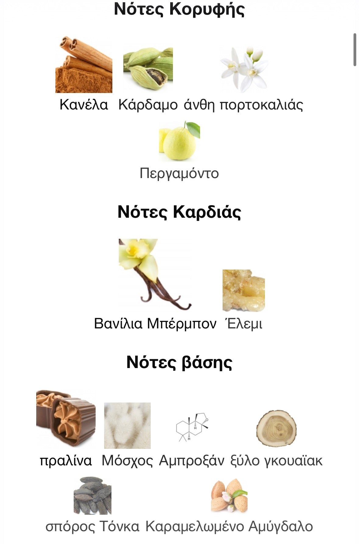 - Ένα γλυκό άρωμα με κανέλα, βανίλια πραλίνα και άνθη πορτοκαλιάς.