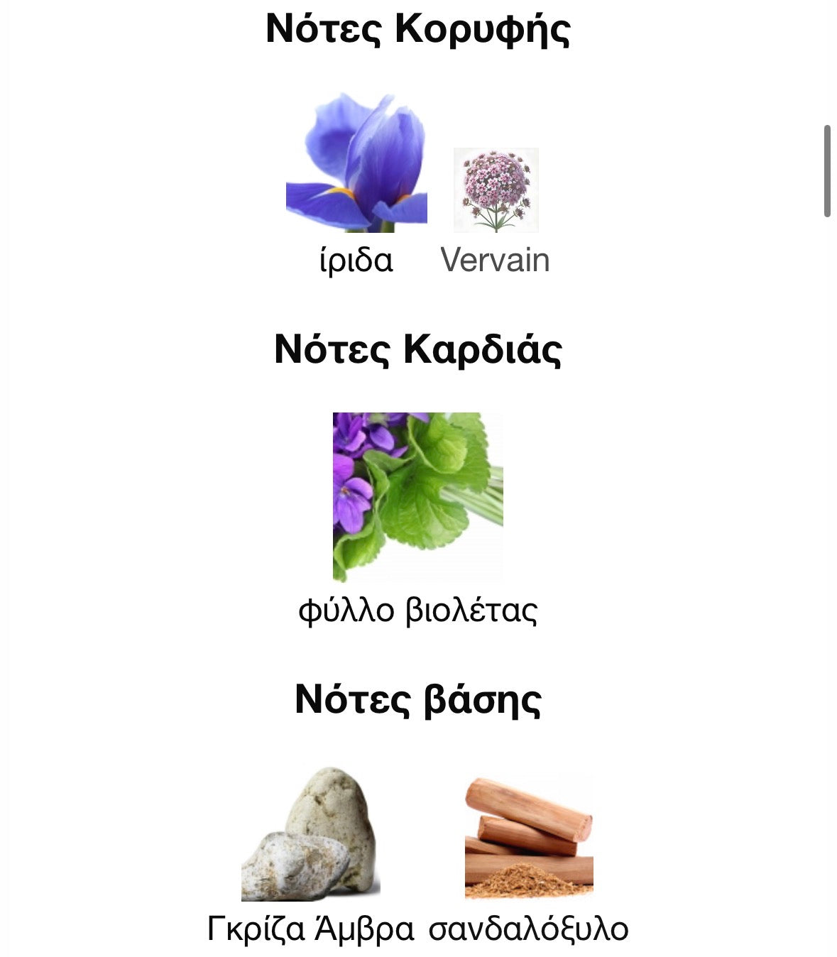 - Νότες: Ίριδα, Βιολέτα, Σανδαλόξυλο.