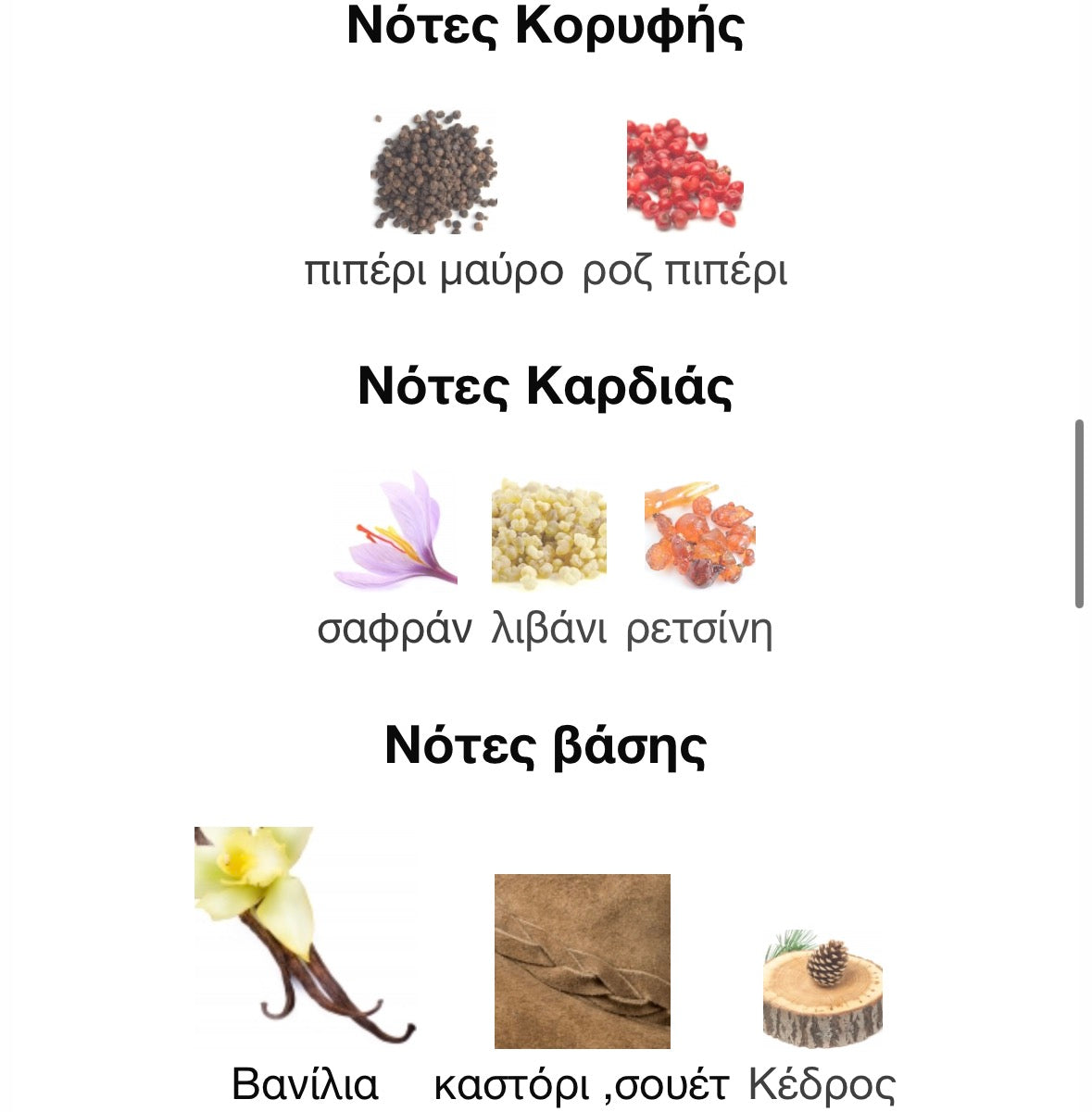 - Ένα γλυκό/spicy άρωμα με πιπέρι, βανίλια και καστόρι/σουέτ.